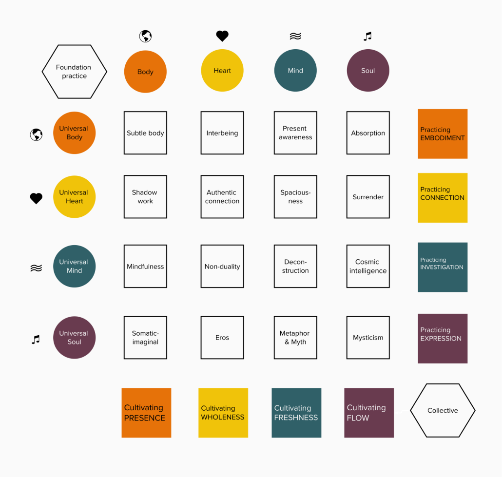 The framework depicts the 16 elements of transpersonal experience. It’s a bit like the periodic table for underlying experience.